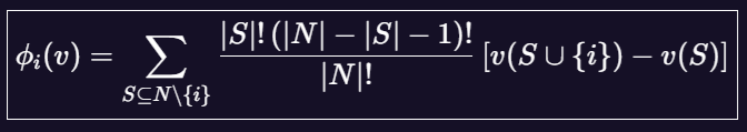 This formula computes the average marginal contribution of feature (i) over all possible feature subsets, ensuring fairness and consistency in attribution.